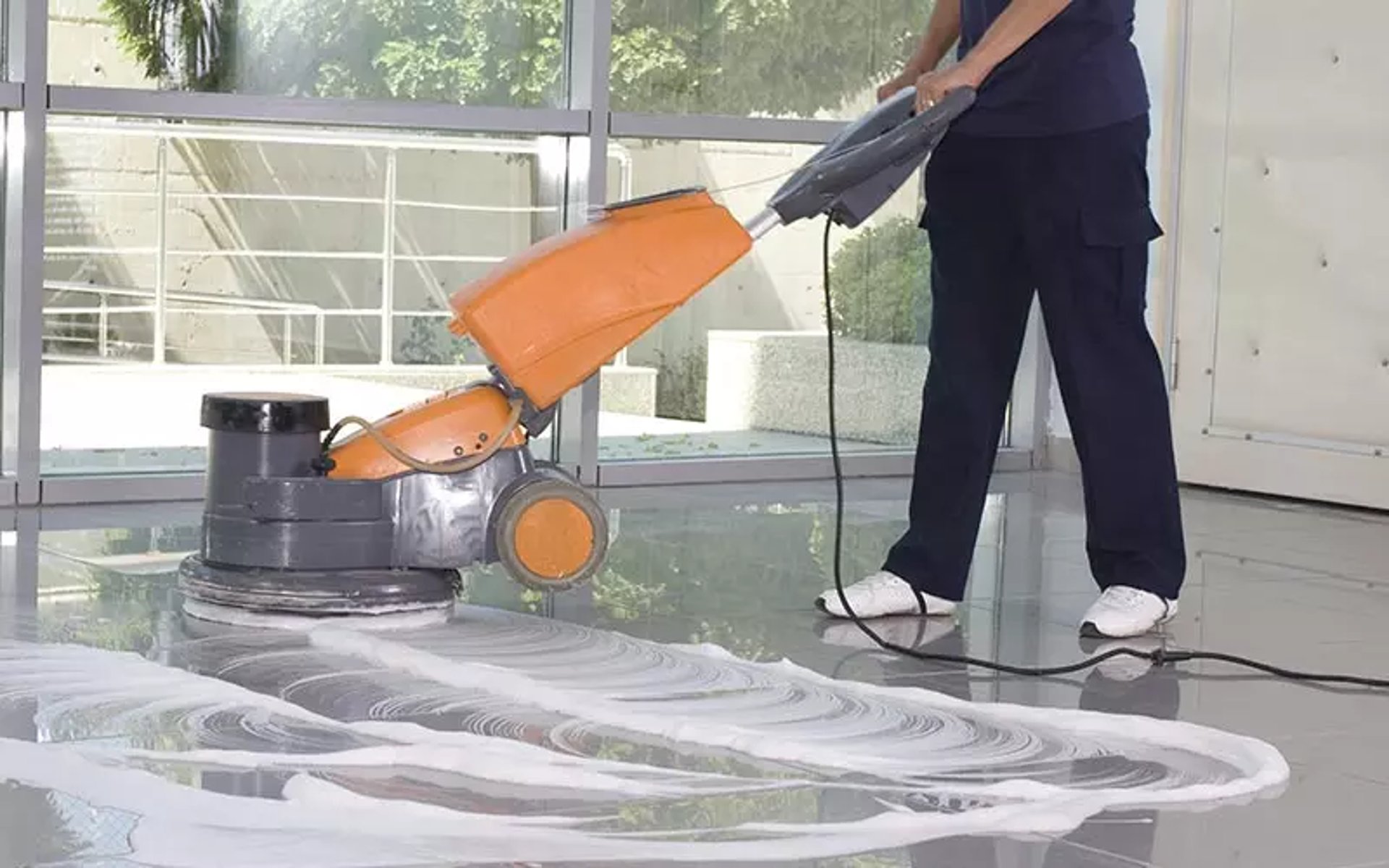 - Lavage mécanique des sols : monobrosse ou autolaveuse selon la surface